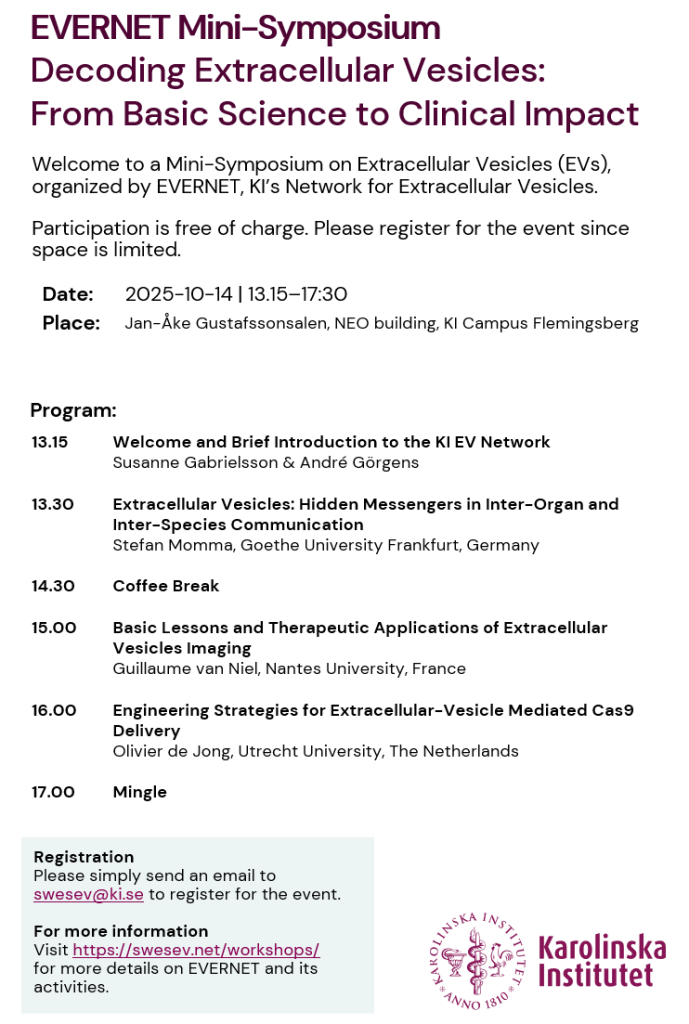 Welcome to a Mini-Symposium on Extracellular Vesicles (EVs), organized by EVERNET, KI’s Network for Extracellular Vesicles.